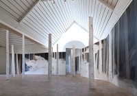 C’est encore en mouvement que se donne le dessin de Min Jung-Yeon lorsqu’il se déploie hors du support traditionnel. Repensée pour le lieu, l’installation « Tissage », créée en 2019 pour le musée Guimet, se déploie ici, en résonance sur trois salles. La forêt mystérieuse où trouve refuge un gigantesque oiseau, d’abord dessinée progresse vers la troisième dimension pour devenir, dans la dernière salle, plumes réelles réalisées en papier. Une sculpture en mouvement de vagues dans laquelle le spectacle s’immerge totalement ; dialogue accentué par l’effet miroir des tissus recouvrant tous les murs. Immersion et mouvement caractérisent aussi l’installation réalisée par l’artiste dans le tunnel en béton proche du centre d’art, datant de la seconde guerre mondiale. Min Jung-Yeon y a peint les parois de manière progressive, d’abord couleur indigo puis tirant vers le jaune citron. Un cheminement vers la lumière qu’accompagne le son spécialement créé par le compositeur coréen Whan Ri-Ahn, diffusé dans le tunnel avec une intensité sonore elle-même progressive.
